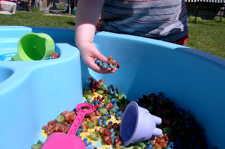 Kids love to play with new textures and colors. This could also be done with rice. Jada and her little friends played with this for a good hour before finding other things to play with.