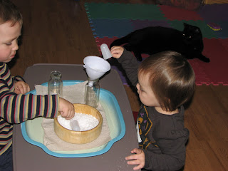 The Epsom salt scooping was a huge hit. However, very, very messy! and when it hits the floor it bounces and hides under the furniture. Also the funnel was too small for the salt so you had to jiggle the funnel to get the salt to pour down into the glass bottle, something Jada has no patience for! At one point I just took the funnel away and she was way more comfortable just scooping right into the bottle. There was a few spills but she was o.k. with that.