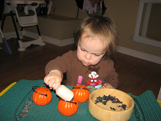 This morning we came down the stairs and Jada went right to the spider scooping activity tray. Before I could even introduce the activity she was making herself busy scooping the spiders and pouring them into the pumpkins.